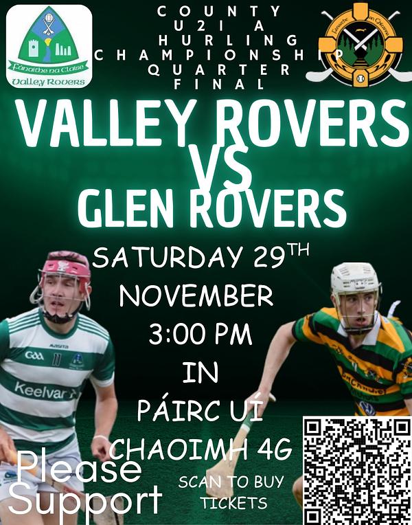 Tickets for this Saturday's U21AHC County QF v Valley Rovers must be purchased in advance by scanning the QR Code below or on the following link: https://www.universe.com/events/glen-rovers-v-valley-rovers-u21a-hc-quarter-final-tickets-8Q9H5T?ref=share-widget-buffer.
